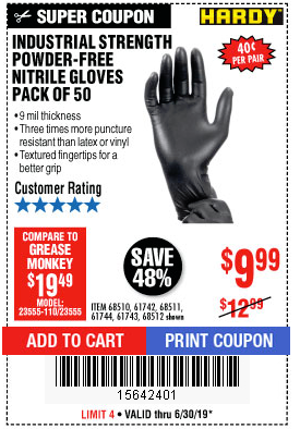 HARDY 9 mil Nitrile Powder-Free Gloves Medium – 50 Pc. Save 58% by shopping at Harbor Freight. ... Medium - 50 Pc. - Item 68510 / 61742 / 68511 / 61744 / 68512 / 61743 ... Search for Air Compressor Coupons HARDY 9 mil Nitrile Powder-Free Gloves – 50 Pc. for $11.99 (Item 57159) has a 5-star rating on HarborFreight.com. Save on Harbor Freight's customer favorites with our super coupons. Search our Harbor Freight coupons for ...