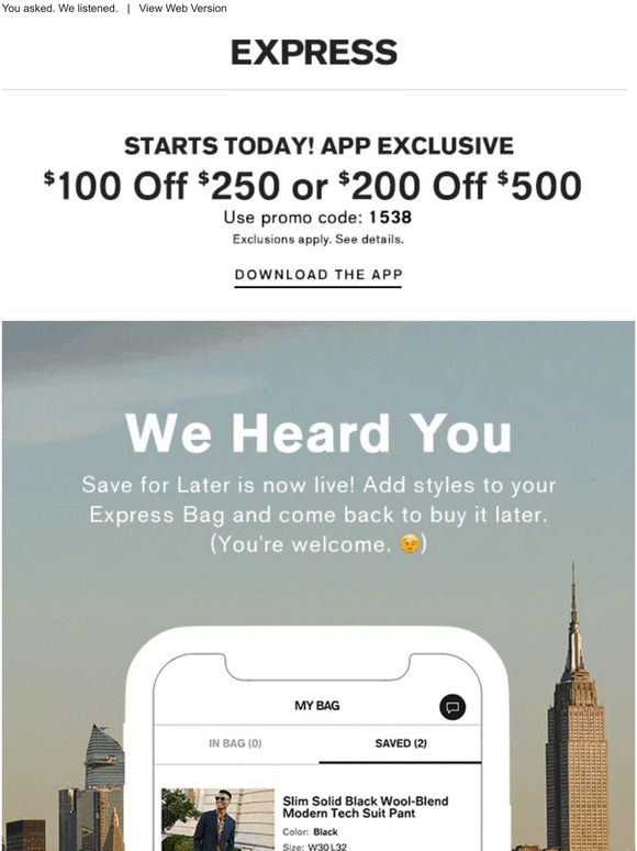 $100 OFF Express Coupons & Promo Codes October 2022 - Insider Use Express Coupon for $100 Off $250+ Code. Verified. 76. $100. OFF. Show coupon code. Expiration date: September 19 ... Download the Express App for $100 Off Purchases $250+ Code: October 30: Take $200 Off Orders $500+ in the App with This Express Promo Code: Code: October 30: